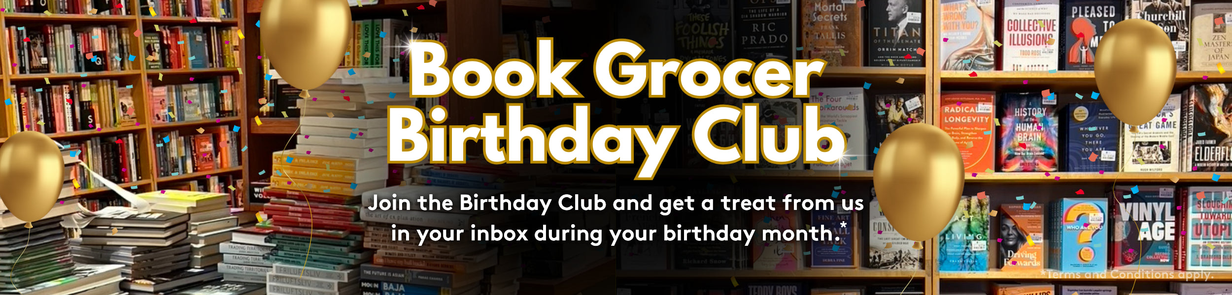 It's free to join the Book Grocer Birthday Club. Simply fill out the short form on our Birthday Club page with your name, email address, phone number (optional) and birth month.