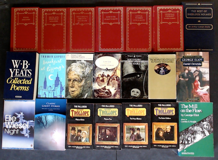 Delve into this remarkable collection of 21 essential literary classics, spanning the 19th and 20th centuries and representing the finest in global fiction, poetry, and memoir. Featuring major works by giants like Dostoevsky, the Brontës, Jane Austen, and several volumes from the famed Palliser series by Anthony Trollope, this box is a treasure trove for any serious reader. From the passionate drama of Victorian England to the deep psychological intensity of Russian literature and the crucial historical testimony of Elie Wiesel, prepare for an immersive reading experience. Each book is secondhand and may show signs of wear.