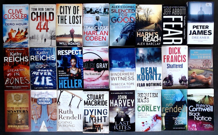 This pulse-pounding collection of twenty-four paperback novels brings together the biggest names in crime and thriller fiction. Featuring high-octane adventures from Clive Cussler, gritty forensic mysteries by Kathy Reichs and Patricia Cornwell, and psychological suspense from Ruth Rendell and Harlan Coben, this box covers every shade of the genre. From the Soviet-era chills of Child 44 to the cozy village crimes of Agatha Raisin, there is a mystery here to keep every detective up all night. Each book is secondhand and may show signs of wear.