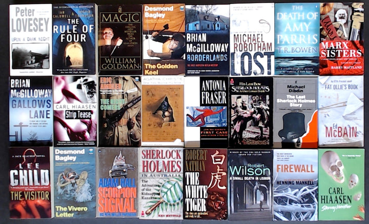 This gripping collection of twenty-four books spans the globe, taking readers from the canals of Venice and the jungles of the Yucatan to the streets of Victorian London and the borderlands of Ireland. The box features award-winning crime fiction from masters like Michael Robotham, Henning Mankell, and Robert Wilson, alongside the satirical bite of Carl Hiaasen and the classic suspense of Desmond Bagley and Agatha Christie. With a strong selection of Sherlockian mysteries and gritty police procedurals, this set offers a diverse range of investigations for the discerning detective. Each book is secondhand and may show signs of wear.