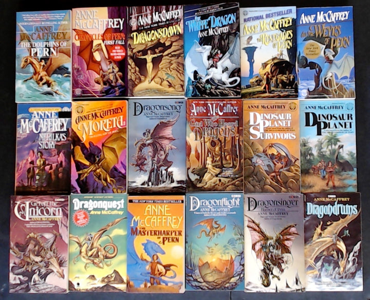 Soar through the skies of Pern with this massive collection of 18 secondhand novels by the legendary Anne McCaffrey, featuring core entries from the iconic Dragonrider series and essential non-Pern science fiction classics. Relive the epic struggle against the deadly Thread, explore the deep history of the planet, and follow the journeys of Weyrleaders, Harpers, and those who bond with Pern's majestic, telepathic dragons. This is the ultimate starter library or series completion pack for fans of imaginative world-building, combining interstellar adventure with classic high fantasy. Each book is secondhand and may show signs of wear.