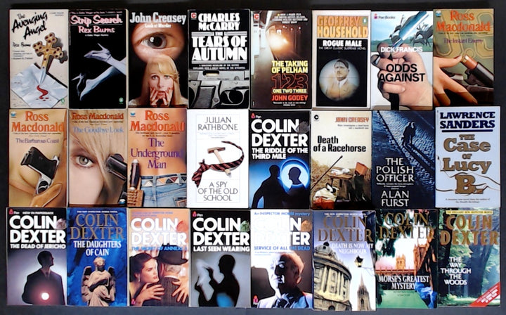 This impressive collection of twenty-four vintage paperbacks offers a comprehensive library of classic detective fiction, espionage thrillers, and hardboiled mysteries. The box is headlined by a massive selection of Colin Dexter’s Inspector Morse novels, providing nearly the entire run of the celebrated Oxford series. Complementing these are four essential Lew Archer mysteries by Ross Macdonald, gritty police procedurals by Rex Burns and John Creasey, and iconic thrillers like The Taking of Pelham One Two Three and Rogue Male. This set is a journey through the evolution of 20th-century crime writing, from the refined puzzles of the whodunit to the dark realism of the private eye. Each book is secondhand and may show signs of wear.