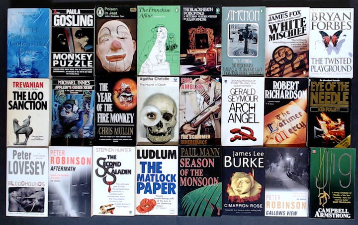 This compelling collection of twenty-four secondhand books spans the full spectrum of the mystery genre, from the Golden Age of detective fiction to gritty modern police procedurals and high-octane espionage thrillers. The box features iconic authors such as Agatha Christie, Ken Follett, and Robert Ludlum, alongside a robust selection of Peter Robinson’s acclaimed DCI Banks series. Readers will find everything from classic locked-room puzzles and atmospheric historical mysteries to pulse-pounding chases across war-torn Europe and the American West. Whether you enjoy the intellectual challenge of a whodunit or the adrenaline of a spy novel, this library offers a diverse range of suspenseful narratives. Each book is secondhand and may show signs of wear.